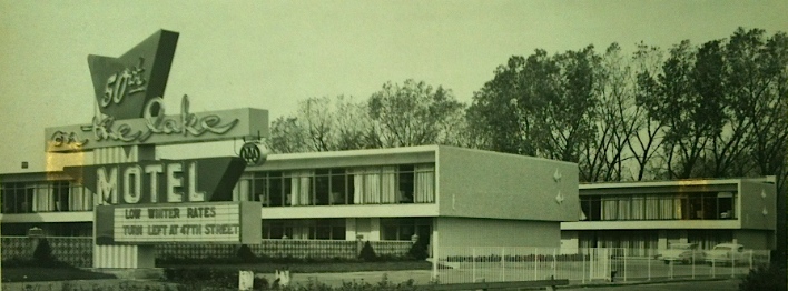 By the time this motel opened, its name and number of rooms had changed to 301 according to the information in the article pictured above left. Above right is a whimsical 50th on the Lake ashtray, perhaps swiped by a guest as a souvenir and sold decades later. Note how this locally owned motel had no apparent visual consistency in signage, marketing material, or in-room items. The 50th on the Lake also once had a colorful lobby with striking lamps and what may be a homemade check-in desk.