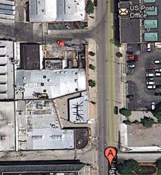 Although severed girders were once visible in area sidewalks, almost no remnants of the Stock Yards Branch exist today. However, at least one structure evidences the branch’s former right-of-way at the site of where its Halsted station once stood. Left: Aerial view of the Stock Yards Branch’s Halsted station, circa 1952. Right: A modern-day aerial view of the same location. The Stock Yard Branch’s right-of-way is evident in the angle of the building that was once to its north.