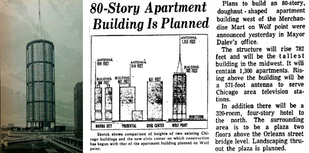 Nearly a half-century before the Kennedy family announced ambitious plans in January 2012 for Wolf Point, this 1,353-foot tall and not-very-subtle “doughnut-shaped” homage to Marina City by PACE Associates inexplicably featured corridors open to the weather between the elevator core and apartments, more than 700 feet in the air. Guests learned more about this and other unbuilt Chicago oddities at FC175.