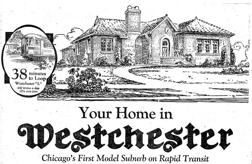 Perhaps no single municipality in the Chicago area was as visibly affected by the 1920s housing crash as west suburban Westchester, which for decades contained seemingly-endless stretches of completed streets and sidewalks and very few actual buildings. A curious Unreal Estate remnant today is a prairie crossed with sidewalks and a 1980s suburban office complex on the horizon, as seen above.